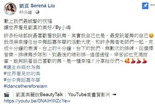自从刘真住院的消息曝光后,据悉老公辛龙在旁陪伴。刘真脸书也从本月12日起就暂停更新,日期她粉专突然更新贴文,内容中写道:“许多粉丝都说最喜欢看我跳舞,其实我自己也是,最爱跳着舞的自己”,并感性地说“这个过程,辛苦却也充满甜蜜,能够跳着自己喜欢的舞,是一种幸福”。