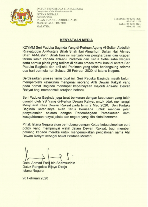 元首:首相人选难产但不召开国会特别会议 28 Feb , 2020 | 民生关注 (吉隆坡28日讯)国家皇宫终于发出文告,不过却是迎来首相人选难产的消息! 国家王宫总管大臣阿末法迪尔指出,国家元首在召见222名国会议员后,仍无法对首相人选筹足简单多数票组新政府,因此新任首相人选难产。 他说,国家元首也同意国会下议院议长莫哈末阿里夫的决定,即不会在3月2日召开国会特别会议,投票选出首相。 他说,元首将会继续与各党党魁及国会领袖协商首相人选,让他们提名首相人选。 他说,元首也感谢所有国会议员过去2天参与会面,以及感谢政府首席秘书莫哈末祖基。 分享
