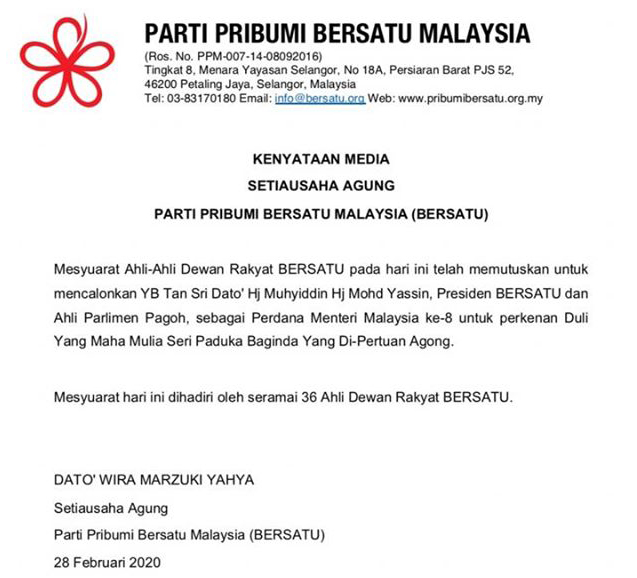 土团党支持慕尤丁为新任首相 28 Feb , 2020 | 民生关注 (吉隆坡28日讯)土团党将向国家元首苏丹阿都拉提名该党总裁慕尤丁为我国第8任首相。 该党总秘书马祖基今日发表简短文告说,该党今日召开会议,共有36名土团党国会议员出席。 他说,土团党国会议员在会议上一致决定,推举慕尤丁成为第8人首相的候选人。 慕尤丁也是巴莪国会议员。 分享