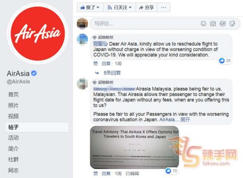 (吉隆坡29日讯)新冠肺炎在日本韩国等地肆虐,泰国亚航允许乘客免费更改日本的航班,马来西亚亚航却迟迟不见有行动。我国网民正在脸书疾呼要求亚航跟进。