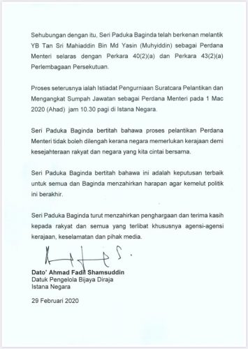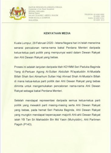 皇宫文告指出,今早从各政党领袖(包括独立人士)提交的首相人选提名,陛下认为,最有可能获得大多数支持的是慕尤丁。