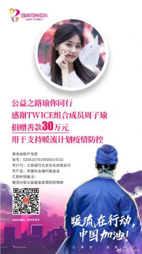 子瑜所属公司JYP娱乐捐出5亿韩元,子瑜也跟进捐出5千万韩元,帮助韩国度过难关,让南韩网友大赞“台湾No.1”,但此举却惹怒大陆网友,不满她在大陆疫情更为严重时也没捐款,并再次扯出她过往台独争议,但也有人缓颊,认为“她在韩国工作、生活,捐韩国也没错啊,不必黑”,双方吵成一片,还因此登上热搜。