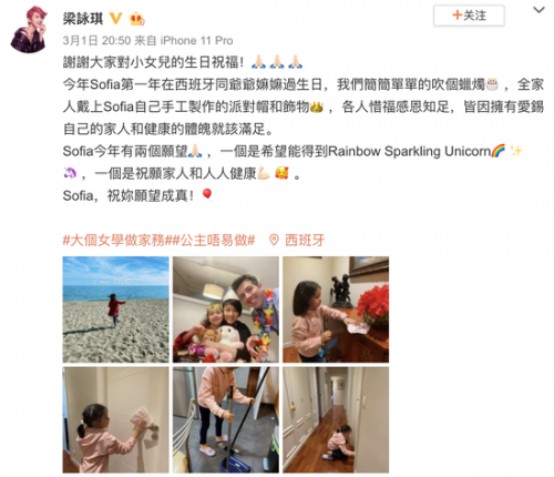 梁咏琪晒全家福为女儿庆生 2 Mar , 2020 | 娱乐前线 梁咏琪在社交平台上晒出一组女儿近照为其庆生。 她发文写道:“谢谢大家对小女儿的生日祝福!今年Sofia第一年在西班牙同爷爷奶奶过生日,我们简简单单的吹个蜡烛,全家人戴上Sofia自己手工制作的派对帽和饰物,各人惜福感恩知足,皆因拥有拥有爱惜自己的家人和健康的体魄。” 照片中,梁咏琪女儿Sofia身穿红色上衣黑色紧身裤,在海边的沙滩上奔跑,头发随风飘起,从背影看出小姑娘十分的可爱漂亮,尤其是一双大长腿更是抢镜。另一组照片中,女儿拿着扫把抹布,在认真打扫卫生,十分懂事。 分享