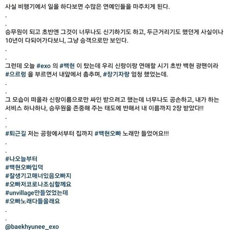 接着,该名空姐继续透露,近日偶然在飞机上巧遇了EXO的伯贤,因为她的老公在两人恋爱初期一直是伯贤的狂粉,热恋期时常常会热唱EXO的经典曲《咆哮》,连舞蹈都能够完美复制,甚至当作“个人技”来炫耀,于是她鼓起勇气跟伯贤要了签名。