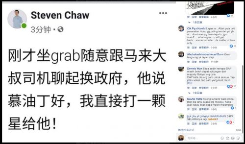 周锦欢在在其脸书发帖“刚才坐Grab随意跟马来大叔司机聊起换政府,他说慕尤丁好,我直接打一颗星给他!”,虽然他在不久后删掉有关贴文,但已被人截图放上网。