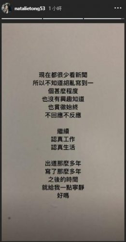 唐诗咏随后在社交网站发文希望谣言适可而止:“现在都很少看新闻,所以不知道胡乱写到一个什么程度,也没有兴趣知道,也贯彻始终不回应,不反应。继续认真工作,认真生活,出道那么多年,写了那么多年,之后的时间就给我一点宁静好吗?”