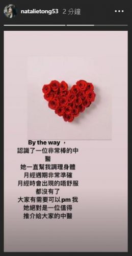 之后,她再上传一段文字,表示月经很准,间接否认怀孕传闻:“By the way,认识了一位非常棒的中医,她一直帮我调理身体,月经周期非常准确,月经时会出现的不舒服都没有了。大家有需要可以pm我,她绝对是一位值得推介给大家的中医。”