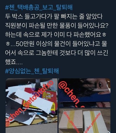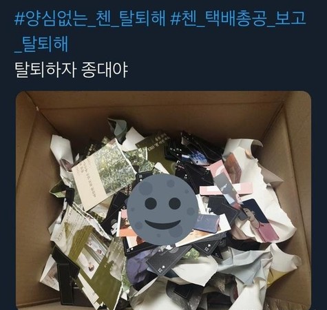 有主张要求CHEN退团的粉丝,发起“快递总攻”,将包括专辑等周边商品,直接寄回SM娱乐表达抗议。原因是在南韩如果是要丢弃大量物品,还需要支付垃圾处理费,“比起来用快递送走能表达自己意见,还用几千块(韩元)就能处理掉垃圾,一举两得!”