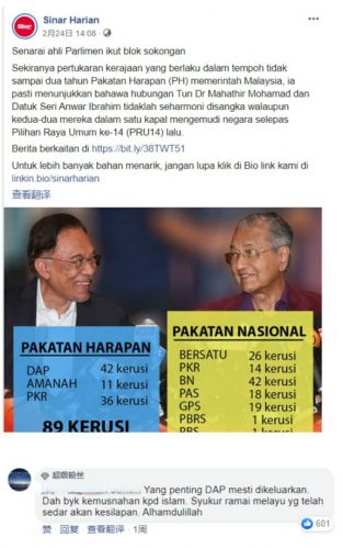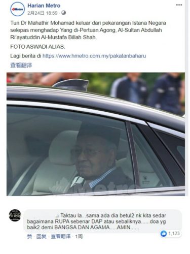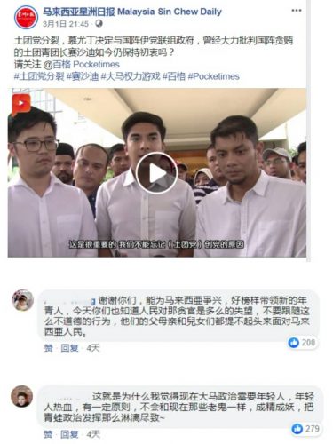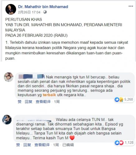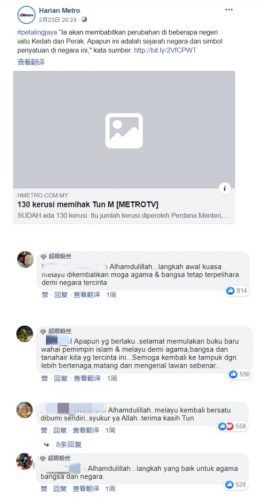值得一提的是,另有4个留言针对敦马一度得到个别朝野政党支持再任首相,声称此为马来人重掌权力与团结,并赞许民族和宗教得以维护,共累积近2500个点赞。