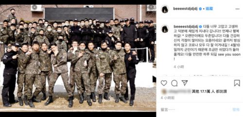 此外,尹斗俊在军中的好人缘也随着这次退伍曝光,许多军人纷纷公开了自己与他的感情,有人就贴出合照写下“能不能不要走,会很想念哥的”,只见两人十指紧扣,看得出浓厚的革命情感,对此粉丝则是搞笑地回应“我反对”、“不行,该把哥哥还给我们了”,引起不少讨论。