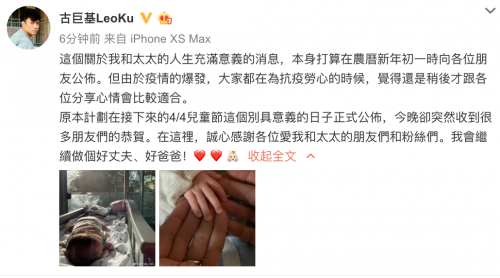 古巨基通过微博宣布已升级当爸爸!