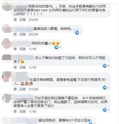 他文中提到会遵守居家隔离14天的指示,唯担心目前在家中缺少了一些日常用品,但也认为:“只要平安回来就好。”许多网友们纷纷留言开骂:“怎么那么快回来,美国50个州你走完了吗?顺便体验一下美国肺炎和美国流感,这些都是美国的特产,只可以在当地体验,不可打包回来。”、“危机意识薄弱……”、“刚刚去他的脸书。。无言,粉丝多数是有戴头巾的而且在贴文留言take care 之列拜托请粉丝们用下你们的智慧与良心好吗??!!!!”,“怎么不等纽约封国了才回来,那时你可以不用回来了😊”,言语非常激动且“恶毒”。