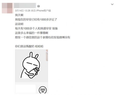 周扬青几乎每天早上都会在私人的微博帐号道早上好,粉丝也不知不觉养成和她说早上好的习惯,让她最近忍不住惊呼:“我天啊!我现在的早上好已经有1000多评论了,这说明每天有1000多个人和我道早上好、报备,这是多么幸福的一件事情啊!”