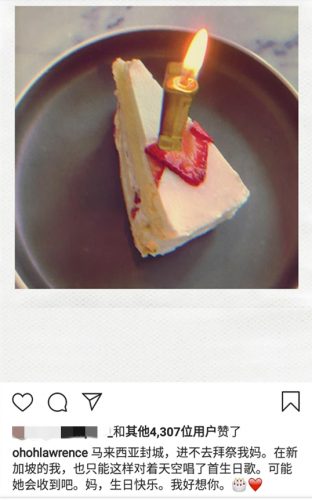 王冠逸因演出中国宫廷剧《延禧攻略》“海兰察”一角而爆红,虽然出身于柔佛新山却早已移居新加坡。今21日适逢母亲的生忌原本打算回马拜祭,不料也因大马行动限制令而无法回国,他在IG po 文感伤的写道:“马来西亚封城,进不去拜祭我妈。在新加坡的我,也只能这样对着天空唱了首生日歌,可能她会收到吧”,最后不忘隔空向天上的母亲说“生日快乐,我好想你”。