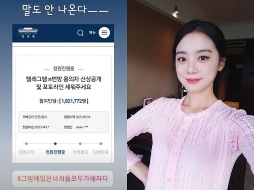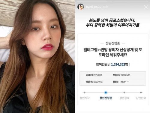 惠利站在女性立场,则在IG上写“比起愤怒更感觉到恐怖,希望能严惩!”惠林则看到新闻“话都说不出来”,并在下方标签“#曾在房间(聊天群组)的你们都是加害者”。此外男歌手赵权、柳升佑、10cm主唱权正烈以及女歌手白艺潾也都表达同样的愤怒,演员则包含文佳煐、夏沇秀、孙秀贤、李英珍等人也都站出来,支持青瓦台请愿。