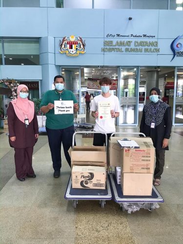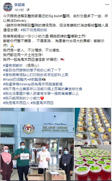 张起政昨日(25)在FB上传多张照片,透露自己亲自送上晚餐到家近的Sg.buloh医院:“今天亲自送餐到离我家最近的Sg.buloh医院,由于份量多了一些,所以无法Delivery…(虽然非常时期到医院的确很危险,但没有让我打消送餐给医护人员这个念头)#我不怕是假的啦,我唯有能捐出一份小小的力量 喂饱前线的医疗战士们!谢谢你们奋不顾身 , 不畏风险 ,为患者付出很大的贡献!谢谢你们! 🙏
