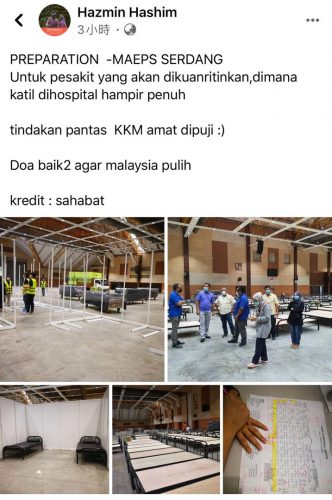 卫生部长今日也巡视临时医院,并正式上载照片,证实这间称为〝Covid-19 Additional Hospital〞的临时医院,将最快投入运作。