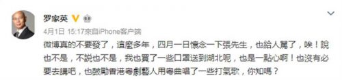 昨天是张国荣逝世17周年,罗家英在微博贴出张国荣照片,并写道“每年的今日,我们一起怀念哥哥,天堂上好吗?”未料遭网友痛批对抗疫情期间,居然未对一线医护人员做出任何感谢之意,这让他气愤表示:“微博真的不要发了,这么多年,四月一日怀念一下张先生,也给人骂了,唉!说也不是,不说也不是,我也买了一些口罩送到湖北呢,也是一点心啊!也没有必要去讲吧,也鼓励香港粤剧艺人用粤曲唱了一些打气歌,你知吗?”