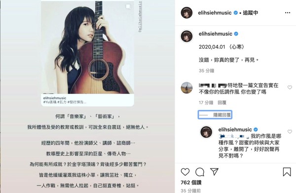 曾获”金曲新人奖“的谢震廷,惊爆和交往4年多,同为歌手的女友张瑀情变!谢震廷今晚突然在IG发文:”原本可以简单处理的事情,请不要冷处理、拖到事态严重、失控、爆发,那真的会很可怕“」稍早又突然写:”2020.04.01〈心寒〉没错,妳真的变了,再见。”