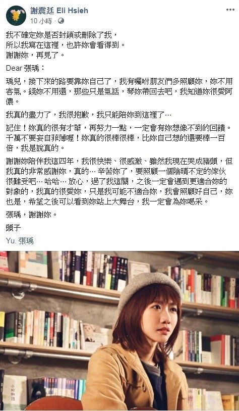 谢震廷和大他3岁的张瑀过去爱得大方,在他拿下金曲奖时正式公开两人关系,也从不避讳分享两人合照、放闪,更带着女友和妈妈一起走过金曲红毯;有忧郁症的他,也曾透露过去病发女友总是陪在他身边,今年1月两人交往4周年时,谢震廷还曾发文感谢女友:“彼此患难与共,成为彼此的导师、知己、伴侣,我何德何能?万分谢谢妳,My Love!从今往后还请多多指教。”没想到今晚却爆出分手,让粉丝都相当遗憾。对此,两人所属种子、爱贝克思都暂未有回应。