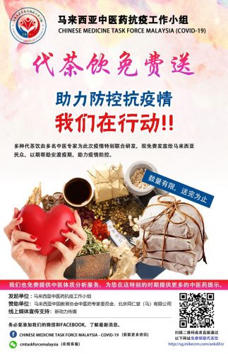 马来西亚中医药抗疫工作小组开始为广大民众提供免费的中医体质分析服务和免费的代茶饮服务。小组也将通过民众提交的资料分析体质,然后给予中医药的生活提示,包括饮食、穴位按摩等。