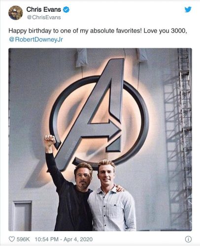 “钢铁人”小劳勃道尼于4月4日度过55岁生日,许多漫威明星祝贺他生日快乐,包括“萨诺斯”乔许布洛林、“浩克”马克鲁法洛都有留言,他的最佳伙伴“美国队长”也有留言“爱你3000”。