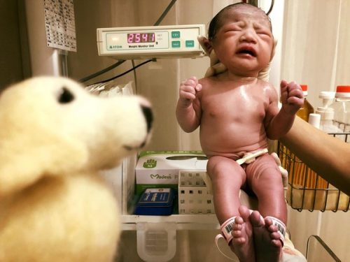 九把刀当爸报喜,6日深夜晒出周亭羽顺产下女儿的照片,一家三口合影同时,他手上也拿着阿鲁造型的娃娃。