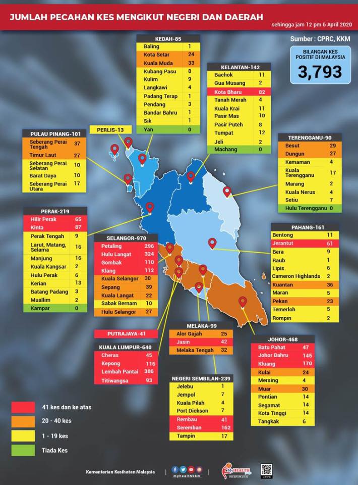 根据卫生部提供的数据显示,截至截至4月6日中午12时,布城(41宗)、野新(42宗)和林茂(41宗),导致这3地区原本从橙区上升为红区。