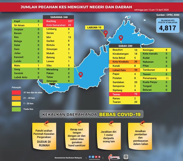 【新冠肺炎】吉隆坡班底谷疫情最严重 14 Apr , 2020 | 民生关注 (吉隆坡14日讯)卫生部指出,截至昨天中午12时,全国最严重疫区为吉隆坡班底谷,目前该区累计确诊病例已破500宗! 根据该部今日发布的最新疫情分布图显示,班底谷前天的确诊病例有496宗,不过昨天却暴增515宗。 除了班底谷,雪州乌鲁冷岳也累计了419宗确诊病例,成为全国第2严重疫区,而八打灵则排在全国第三,有346宗确诊病例。 文告指出,国内红区和绿区依旧保持不变,即为26和28个。 卫生部不忘在文告中温馨提醒民众,在行动管制令期间,国人继续留在家中、保持社交距离和勤洗手。 分享