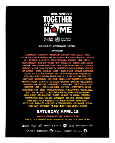 参与此次演出的艺人名单如下:女神卡卡(Lady Gaga)、克里斯马丁(Chris Martin)、约翰传奇(John Legend)、席琳狄翁(Celine Dion)、珍妮佛罗培兹(Jennifer Lopez) 、泰勒丝(Taylor Swift)、怪奇比莉(Billie Eilish)、安德烈波伽利(Andrea Bocelli)、艾尔顿强(Elton John)、保罗麦卡尼(Paul McCartney)、史提夫汪达(Stevie Wonder)、珍妮佛哈德森(Jennifer Hudson)、山姆史密斯(Sam Smith)、尚恩曼德斯(Shawn Mendes)、艾丽高登(Ellie Goulding)、艾莉西亚凯斯(Alicia Keys) 、1世代连恩(Liam Payne)、1世代奈尔(Niall Horan)、杀手乐团(The Killers)、洁西J(Jessie J)、FINNEAS、欧普拉(Oprah Winfrey)、山缪杰克森(Samuel L Jackson)、詹姆斯麦艾维(James McAvoy)、大卫贝克汉(David Beckham)、海蒂克隆(Heidi Klum)、莎拉洁西卡派克(Sarah Jessica Parker)、杰森席格(Jason Segel)、克布雷克(Jack Black)、麦可布雷(Michael Bublé)、亚当蓝伯特(Adam Lambert)、赫齐尔(Hozier)、芮塔欧拉(Rita Ora)、杰克强森(Jack Johnson)、恶女凯莎(Kesha)、怀旧女郎(Lady Antebellum)、丽珠(Lizzo)、CP查理(Charlie Puth)以及安妮蓝妮克丝(Annie Lennox)等等。