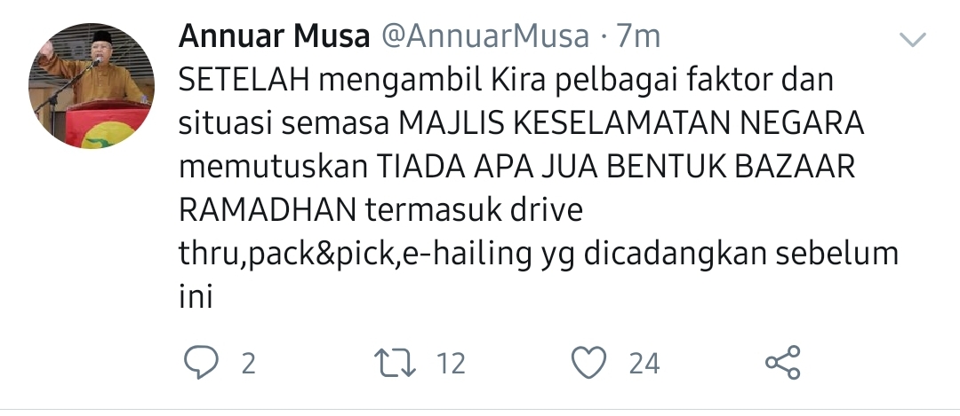 【行动管制令】斋戒月市集不以任何形式举办 16 Apr , 2020 | 民生关注 (吉隆坡16日讯) 又U转了! 早前联邦直辖区部长安努亚慕沙指出,今年度的斋戒月市集将会以3种方式进行,分别是得来速(Drive Thru)、自取(Pack&Pick)以及外送服务(E-Hailing),不过,这项决定再次U转。 他今日在推特发贴文时指出,经过考量,以及国家安全理事会给予当前情况的分析后,该部决定今年将不会举办任何形式的斋戒月市集,包括得来速、自取和外送服务。 分享