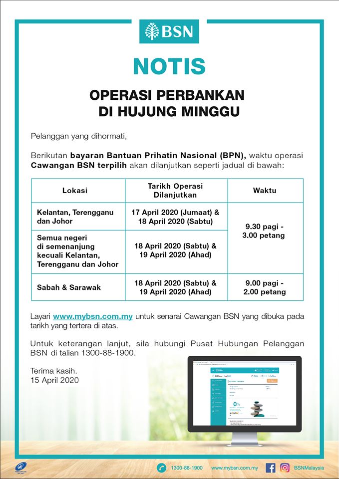 (吉隆坡17日讯)财政部第二副部长莫哈末沙哈指出,若那些符合资格领取国家关怀援助金(BPN)但却没有银行户口的受惠者,国民储蓄银行(BSN)部分分行将会在4月17至19日开放让民众领取援助金。
