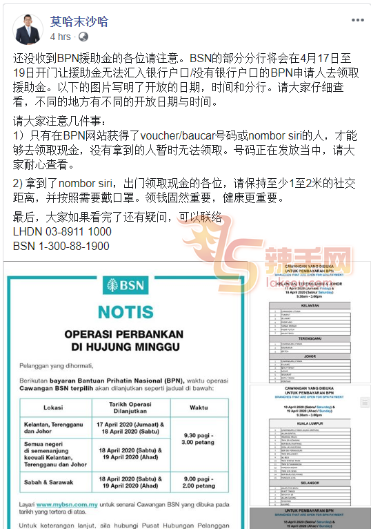 此外,他也在贴文提醒直接到银行领取援助金的受惠者数项需注意的事情,如民众必须在国家关怀援助金网站获得凭证(voucher)号码或序号(nombor siri),才能领取现金,没有相关序号者暂时无法领取。