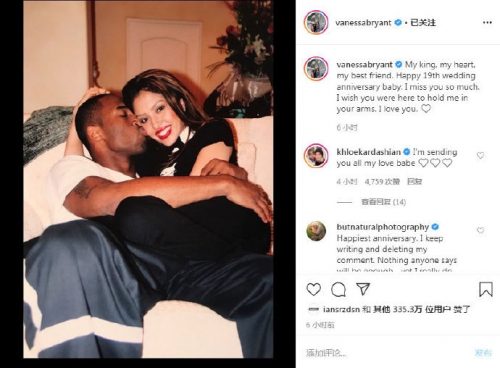 照片中的瓦妮莎一身黑色连衣裙,在科比的怀抱中笑得灿烂,而科比则亲吻爱妻。瓦妮莎还配文“我的国王,我的心肝,我最好的朋友,结婚19周年快乐,宝贝。我好想念,我希望你在这里拥我入怀。我爱你。”