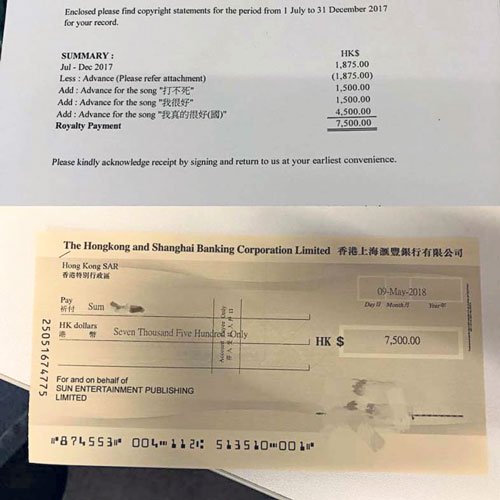沈震轩去年推出3首单曲,其中包括2首粤语歌及1首华语歌,16日在面书晒出支票,“第一次收到一张来自我创作的歌曲《打不死》《我很好》和《我真的很好》的支票。”3首单曲创作费,仅获得7500港币(约3800令吉)。