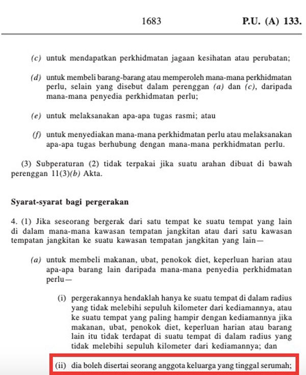 其中,法令中行动条例第(4)(1)(a)条文,即外出购买日常用品的条文中,加入了附加(ii)条文,即外出人士可以由一名家庭成员陪同。