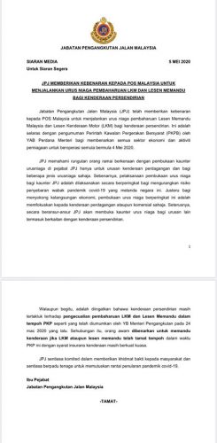 邮政局可处理更新个人路税 5 May , 2020 | 民生百事 (吉隆坡5日讯)邮政局可从即日起处理更新个人路税事务! 陆路交通局(JPJ)发出文告指出,有鉴于民众从週一起即涌往各陆路交通局分局中,申请更新个人路税;所以,从即日起民众可以前往邮政局,该局已允许邮局恢复这项服务。 所以,陆路交通局目前只会进行商业车辆更新路税,或其他商用车辆事务,个人路税更新促请公众前往邮局处理。 此举也是为了分散民众聚集,同时也希望无论前往邮局或陆路交通局办理事务者,都要注重社交距离,同时避免疫情的扩散。 分享