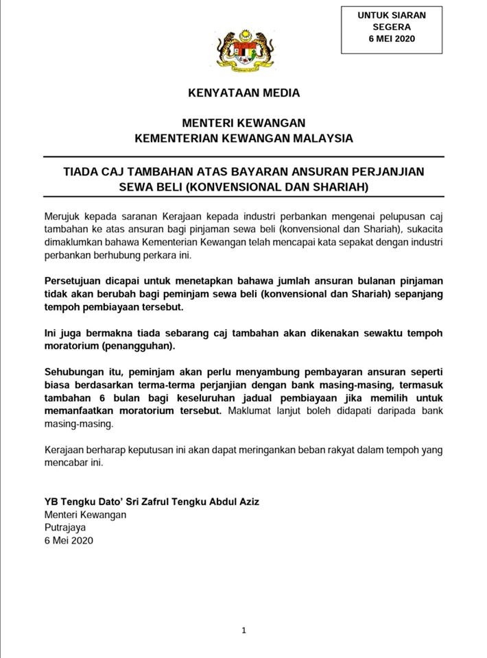 (布城6日讯) 财政部长东姑扎夫鲁宣布,该部已经和各银行达成共识,所有“租购融资”(hire purchase)的延期供款,将不再征收任何附加利息。