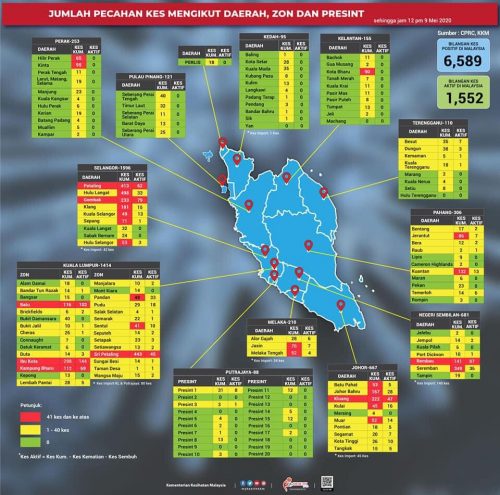 疫情红区是吉隆坡峇都(102宗)、隆市区(144宗)、甘榜峇鲁(69宗)和大城堡(45宗)、雪州八打灵再也(62宗)、鹅唛(79宗)、柔佛居銮(47宗)、森美兰林茂(87)、砂拉越古晋(92宗)和三马拉汉(39宗)。