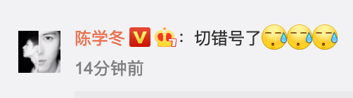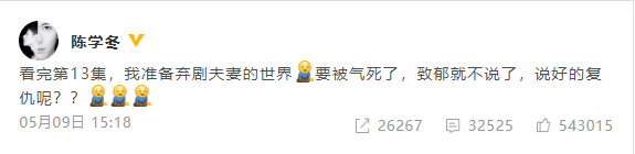 陈学冬吐槽《夫妻的世界》 扬言要弃剧 随后尴尬称切错号了 11 May , 2020 | 娱乐前线 陈学冬在微博发文疯狂吐槽韩剧《夫妻的世界》,随后在评论区尴尬留言:“切错号了”。 陈学冬在微博发文吐槽韩剧《夫妻的世界》,表示:“看完第13集,我准备弃剧夫妻的世界,要被气死了,致郁就不说了,说好的复仇呢??” 随后在评论区尴尬留言:“切错号了”,并配上三个流汗的表情,搞笑十足。 分享