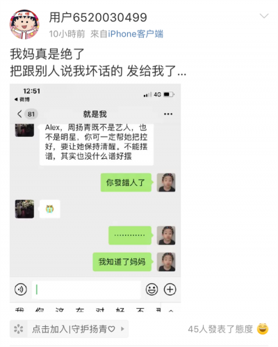 周扬青妈妈传讯拜托友人看好女儿,别让她太自以为是,“周扬青既不是艺人,也不是明星,你可一定帮她把控好,要让她保持清醒,不能摆谱,其实也没什么谱好摆。”但是却把讯息错传给女儿,周扬青傻眼回:“你发错人了,我知道了妈妈。”