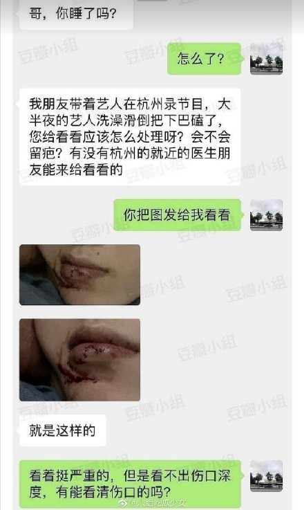 有网友发文爆料,一位外科医生突然在微信朋友圈发文,自称大半夜受到娱乐圈朋友求助,有艺人洗澡滑倒弄伤下巴,并表示是否有在杭州的医生朋友,如果有时间的话可以帮忙看看,该名艺人疑似就是范丞丞。