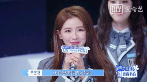 蔡卓宜以81万274票得到第25名,她坦然接受成绩,并没有为此而哭。她先感谢青春制作人们的投票,“25名对我来说已经是一个非常非常高的名次,我觉得我已经做到了在舞台上的可能。”最后,她也趁机向妈妈说:“我爱你,还有爸爸,母亲节快乐。”