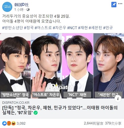 韩国新冠肺炎疫情因为梨泰院夜店感染事件持续扩大,爆发第二轮疫情高峰,日前便传出有偶像团体去过梨泰院夜店,而稍早南韩媒体《Dispatch》曝光,去夜店的就是BTS的田柾国、ASTRO车银优、NCT郑在玹与SEVENTEEN金珉奎,对此公司也回应了。