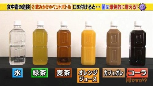 日本节目《月曜夜未央》(月曜から夜ふか)做了一个瓶装饮料含菌量实验,以水、绿茶、麦茶、橙汁、Latte、可乐这6种饮品作测试对象,工作人员先将每款瓶装饮料打开喝一口,然后再将饮料放置在模拟常温的环境,温度在摄氏28度、湿度70%的空间静置24小时,放隔夜后检测每款饮品的金黄葡萄球菌含量。