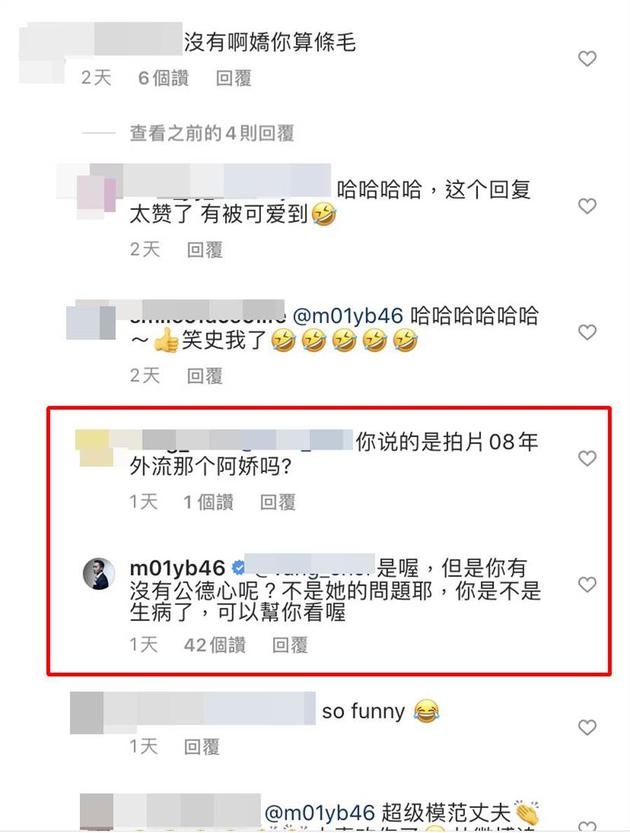 赖弘国不只护阿娇,他被网狠呛:“没有阿娇你算什么?”赖弘国也大方的回复:“谢谢你的指教,我只是一个医生,有除毛的需求欢迎咨询”,还有人问:“你是阿交的前夫?”赖弘国则回:“阿娇”,纠正网友超幽默。