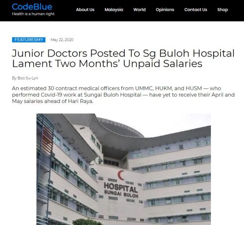 根据医学网站《CodeBlue》报导,有大约30名来自马大医学中心、蕉赖国大医院、与理科大学医院的初级医生,在3月被调往双溪毛糯医院对抗新冠肺炎,但4月和5月都仍未發薪。