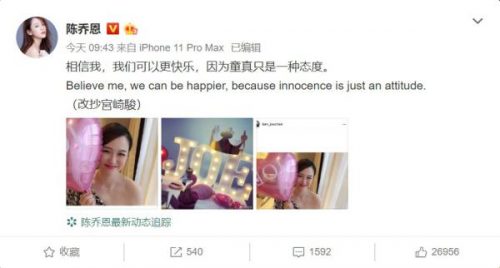 在大家怀疑两人分手之时,陈乔恩再度发文,并引用了宫崎骏的名言:“相信我,我们可以更快乐,因为童真只是一种态度。”,并附上与心型气球的合照,仿佛沐浴在爱情中。