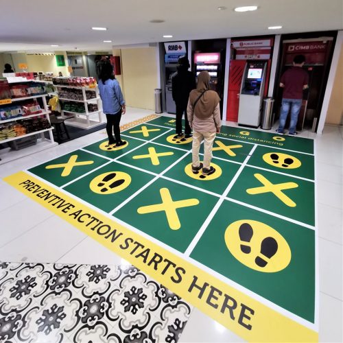 此外,金河广场也在其他容易聚集人群的地方贴上创意贴纸,像是ATM机台前的OX棋、电梯前的PAC MAN等等,让你在保持社交距离的同时,又能感到好玩,不那么无聊!