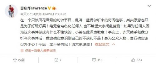 吴启华也透露,前一天和助理一起分析这次的事件,确实意识到自己的错误,“身为公众人物,言行确实该份外小心!今后一定不会再犯!请大家原谅!”